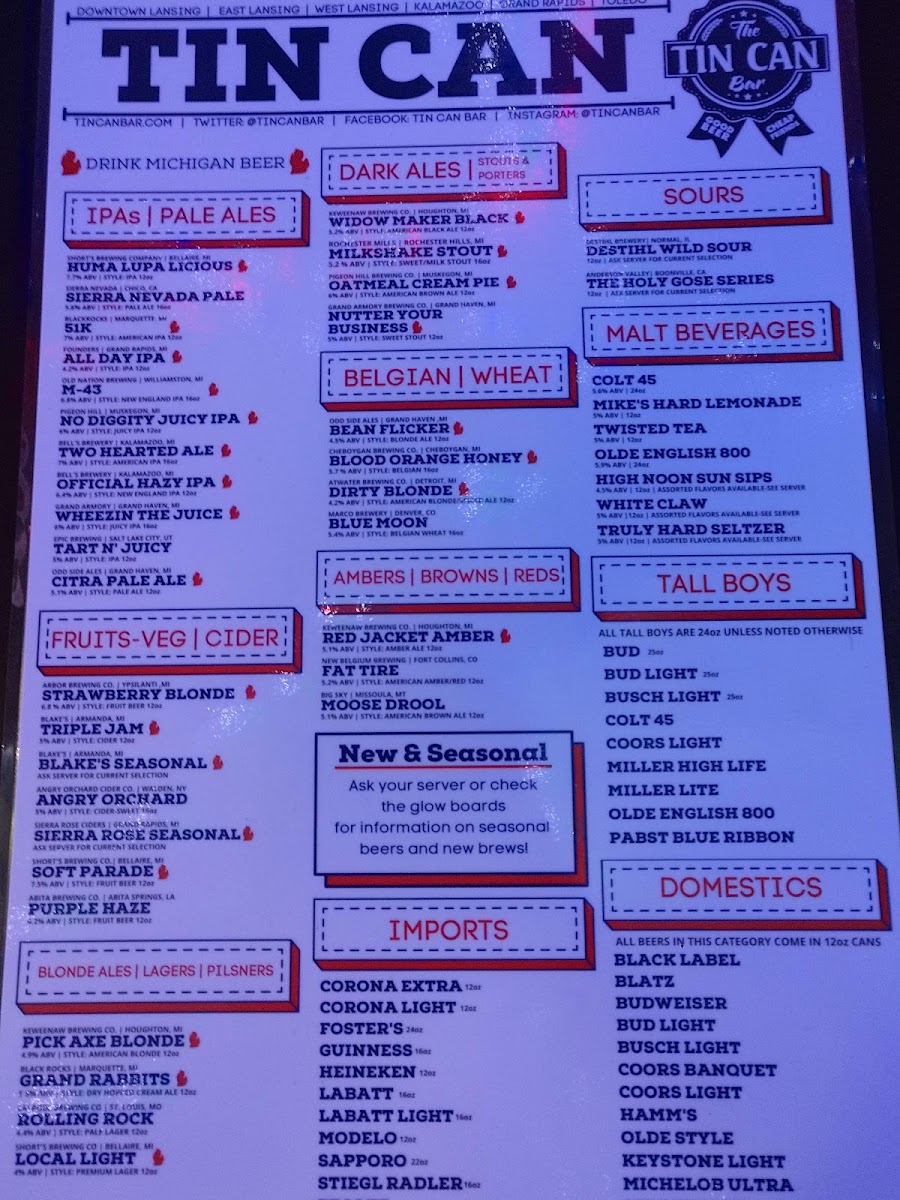 Welcome to Tin Can Bar, a vibrant gem nestled at 408 E Michigan Ave, Lansing, MI. This shot bar is celebrated for its laid-back atmosphere and an impressive selection of drinks. Whether you're in the mood for a refreshing Belgian wheat beer like Bean Flicker or a classic import like Guinness, Tin Can has something for everyone.